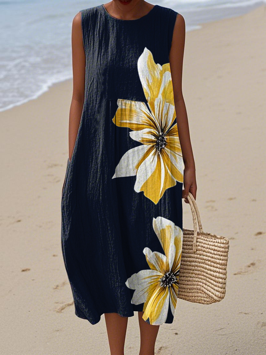 Women's Elegant Floral Print Cotton and Linen Dress