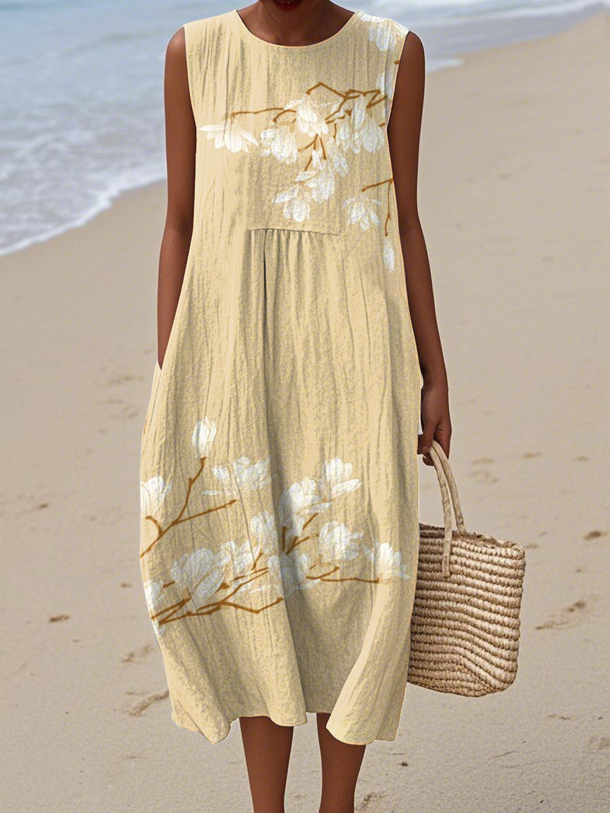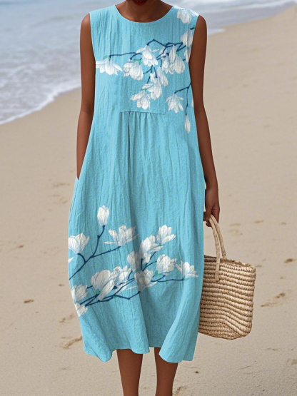 Women's Elegant Floral Print Cotton and Linen Dress