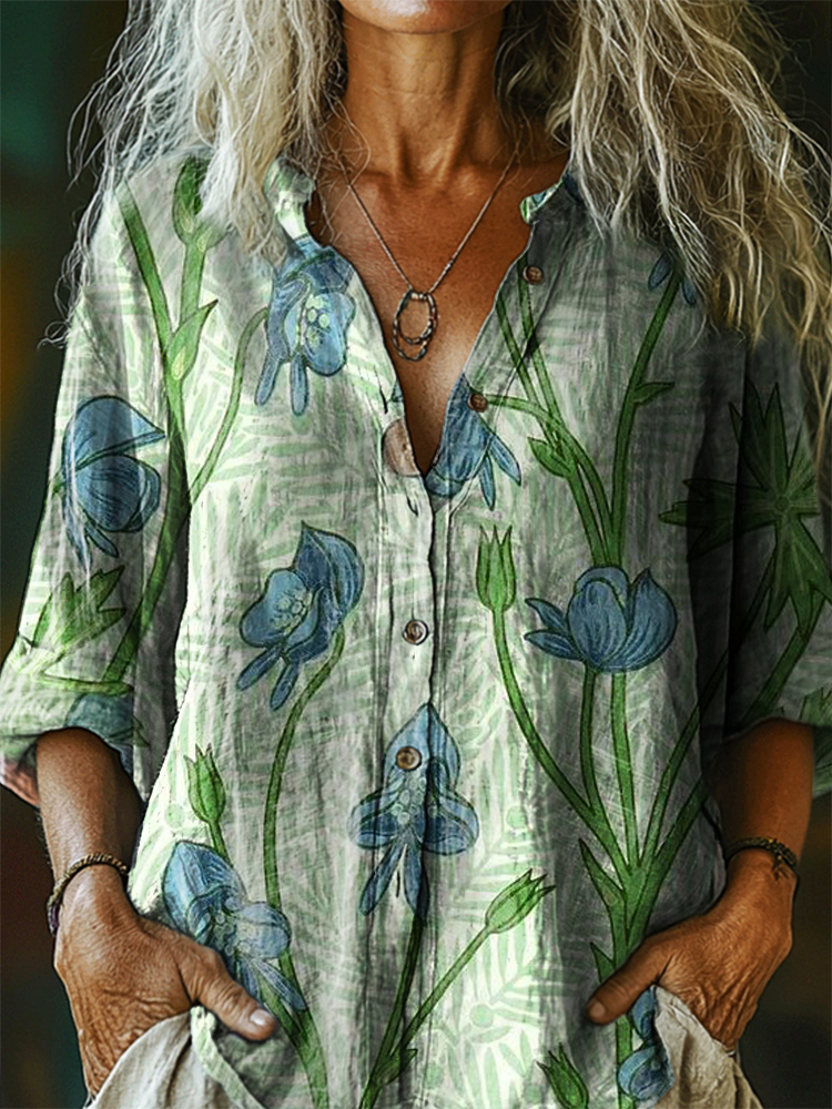 Women's Floral Pattern Art Print Casual Cotton Linen Shirt