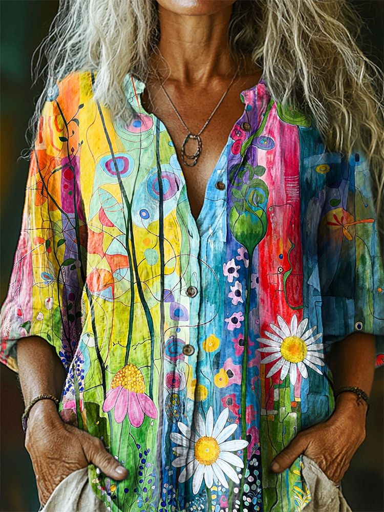 Women's Floral Pattern Art Print Casual Cotton Linen Shirt