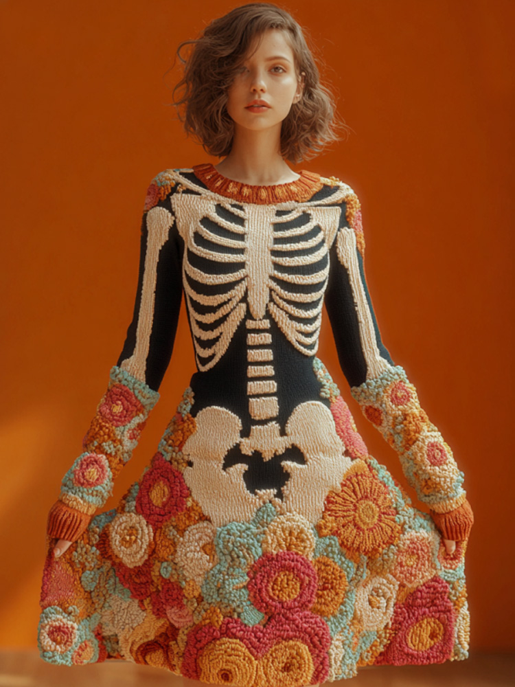 Women's Halloween Warm Tone Skull Rose Embroidered Dress