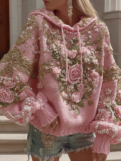 Women's Pink Floral Art Cozy Knit Hooded Sweater
