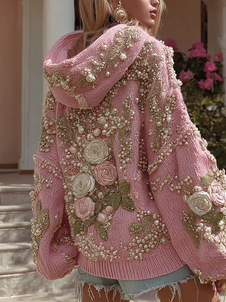 Women's Pink Floral Embroidery Art Cozy Knit Hooded Sweater