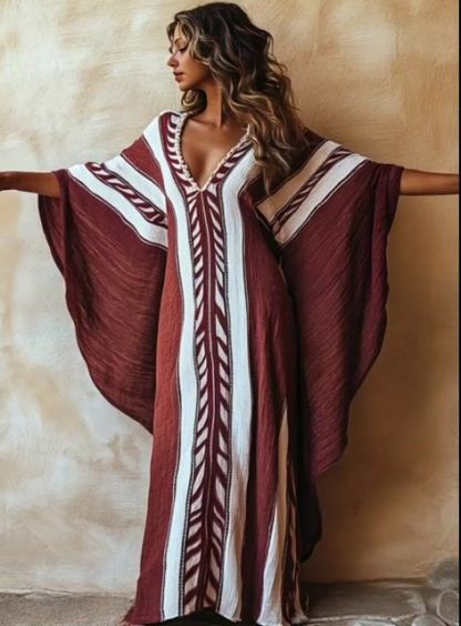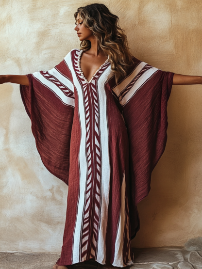 Women's Red and White Linen Short Sleeve V-Neck Kaftan