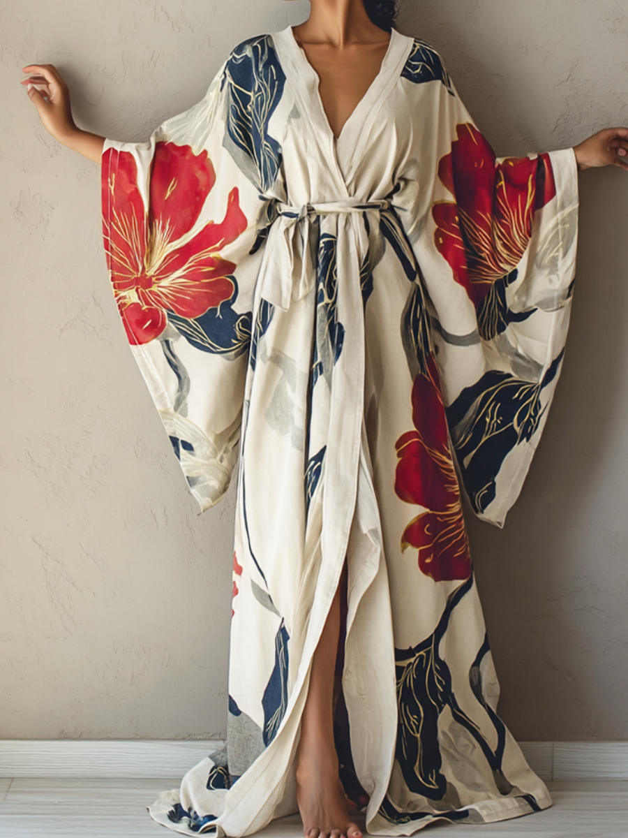Women's Red Floral Kimono Linen Robe (Including Belt)