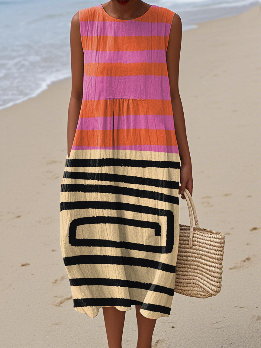 Women's Retro Abstract Geometric Print Cotton and Linen Dress