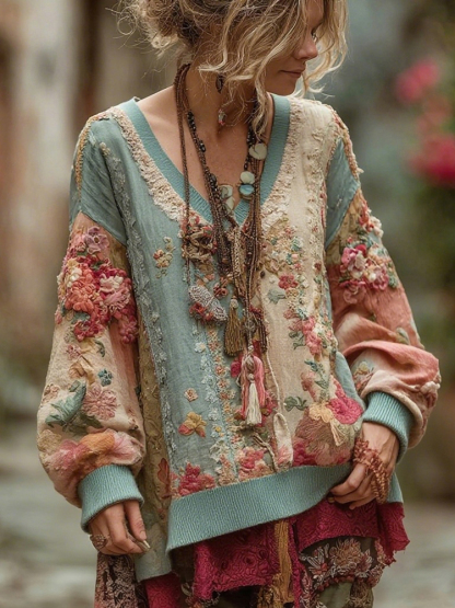 Women's Retro Bohemian Floral Pattern Comfortable Warm V-neck Sweatshirt