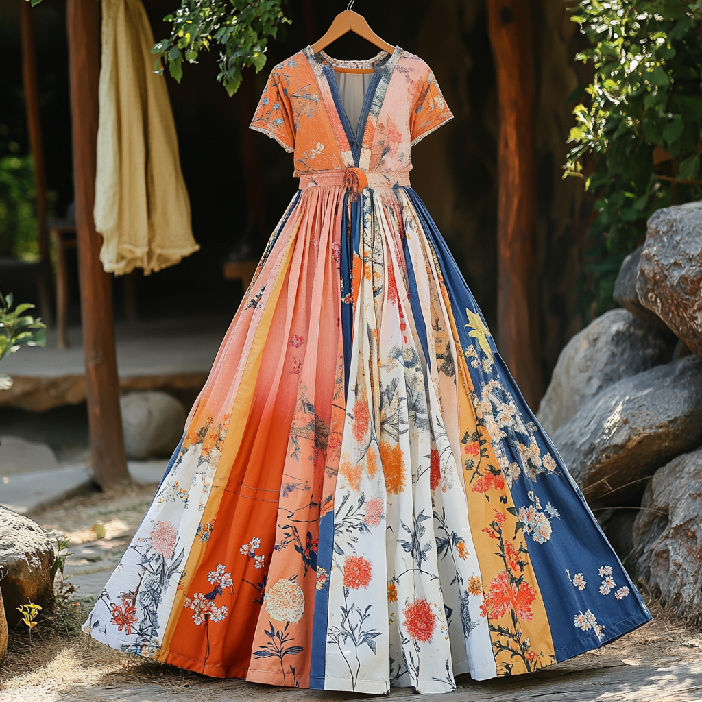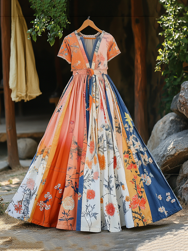 Women's Retro Floral Colorblock Casual Short Sleeve Dress