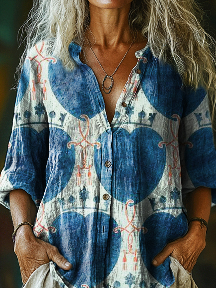 Women's Retro Heart Patterned Art Print Casual Cotton Linen Shirt