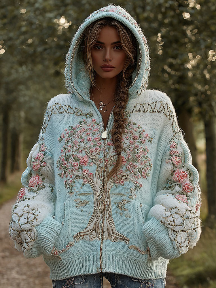 Women's Viking Pink Rose Tree Of Life Knit Zip-up Hooded Sweater