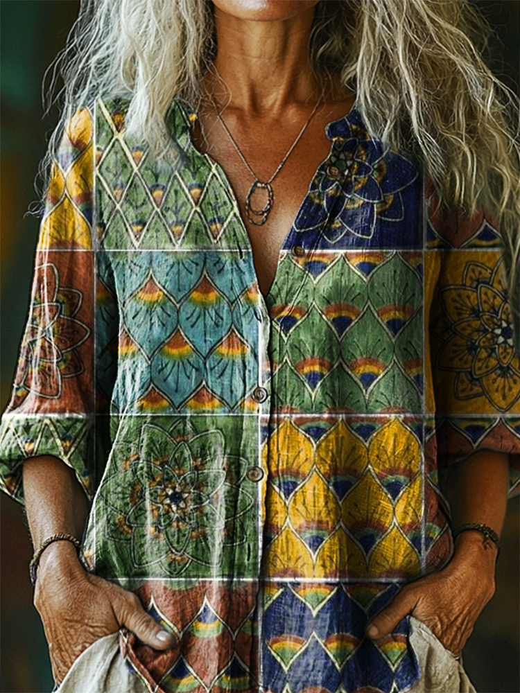 Women's Vintage Bohemian Floral Art Print Casual Cotton Linen Shirt