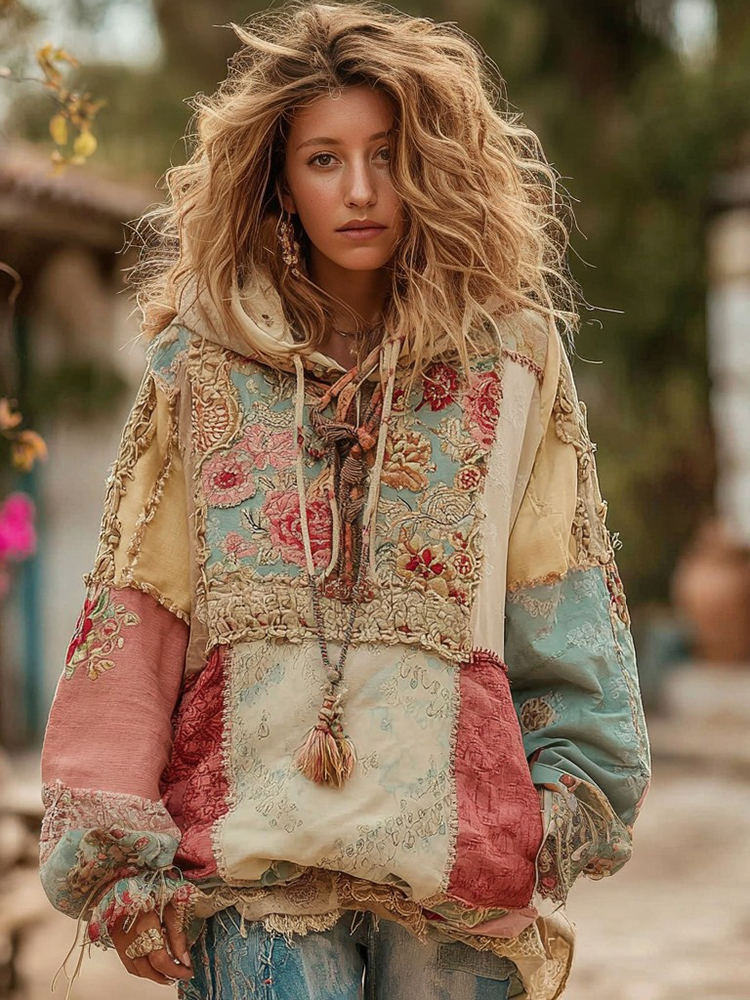 Women's Vintage Bohemian Floral Panel Cozy Warm Hoodie