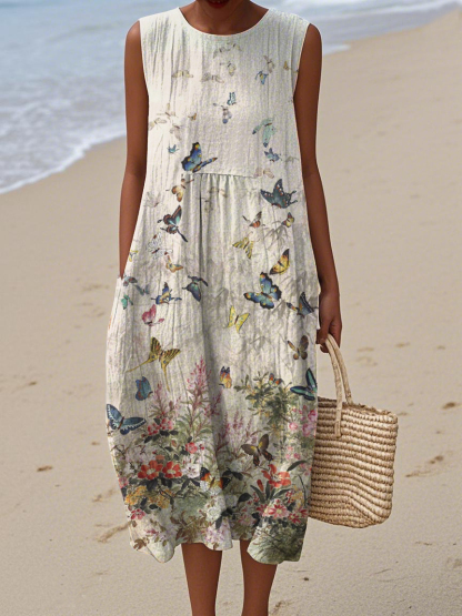 Women's Vintage Butterfly Floral Print Cotton and Linen Dress