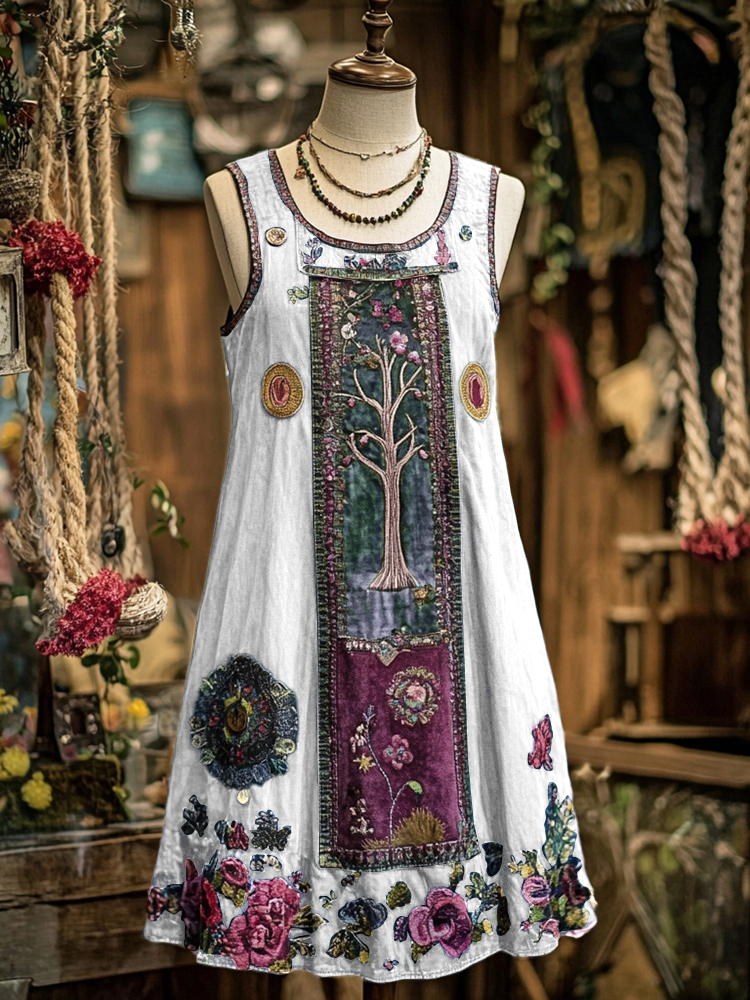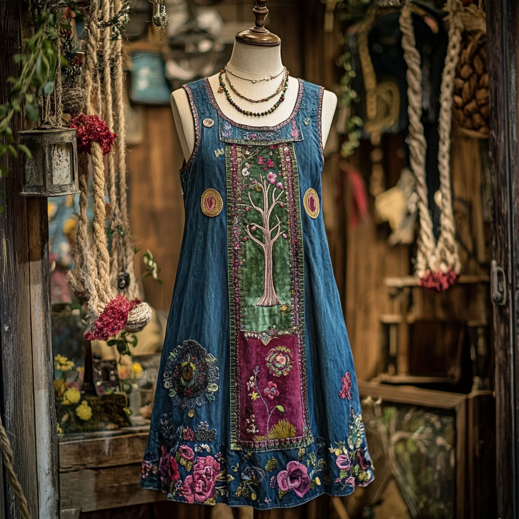 Women's Vintage Denim Velvet Tree Panel Sleeveless Dress