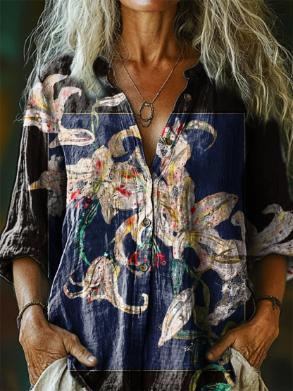Women's Vintage Ethnic Floral Art Print Casual Cotton Linen Shirt
