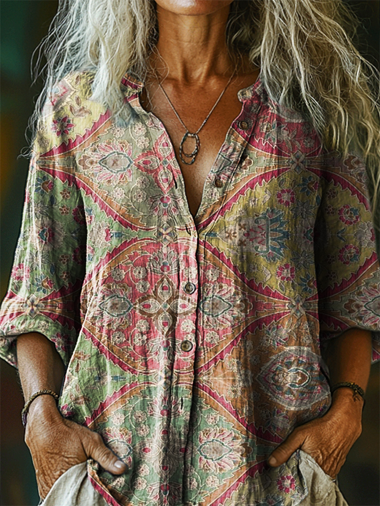 Women's Vintage Ethnic Floral Art Print Casual Cotton Linen Shirt