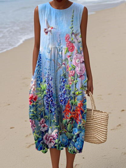 Women's Vintage Floral Hummingbird Print Cotton and Linen Dress