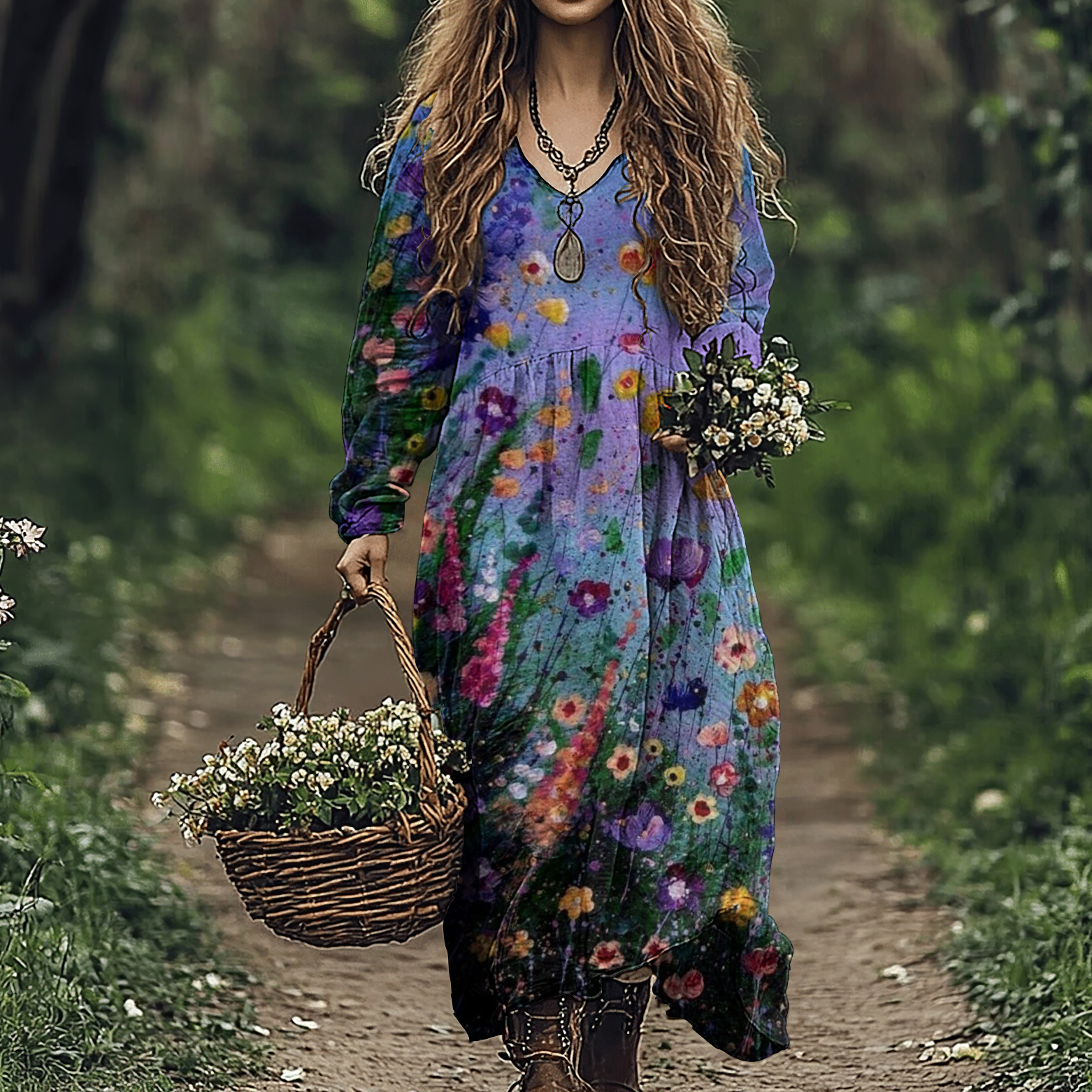 Women's Vintage Flowers Art Linen Blend Maxi Dress