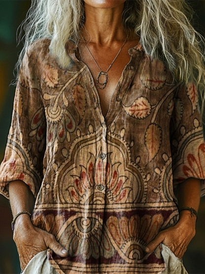 Women's Vintage Folk Floral Art Print Casual Cotton Linen Shirt