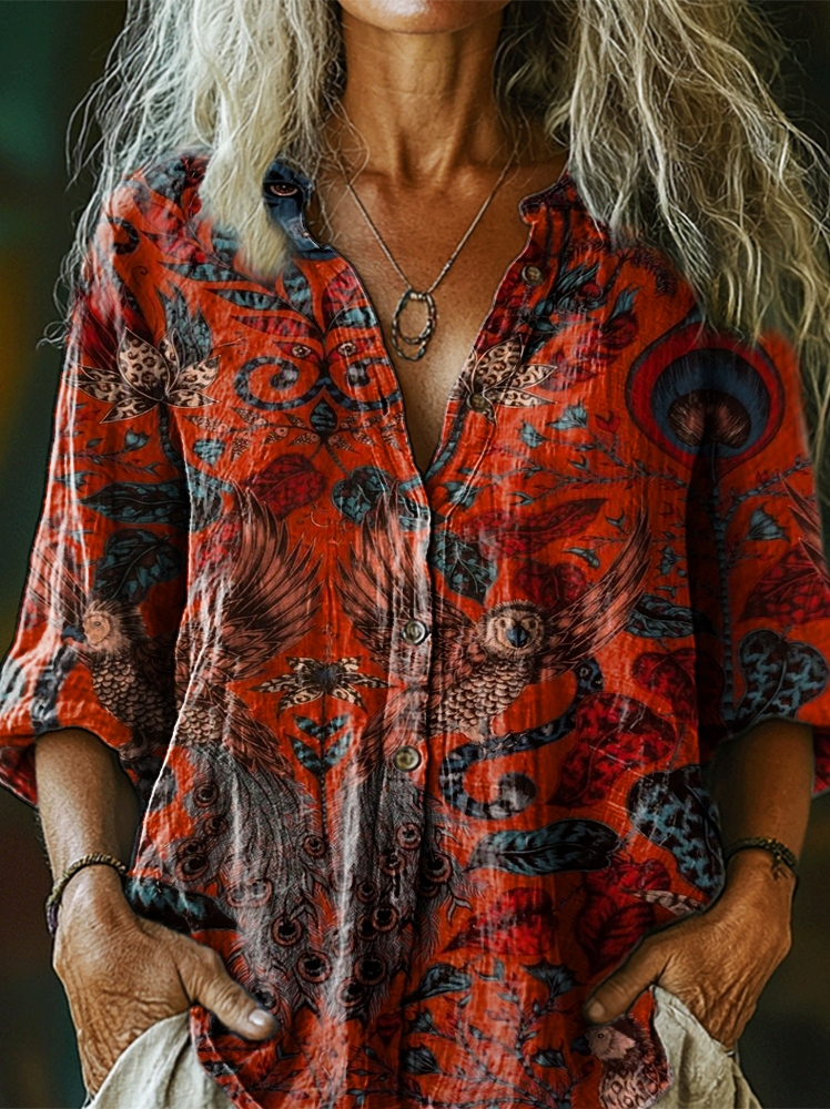 Women's Vintage Folk Floral Art Print Casual Cotton Linen Shirt