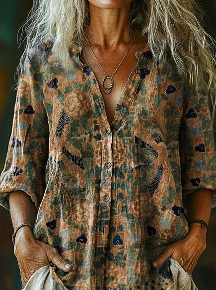Women's Vintage Folk Floral Art Print Casual Cotton Linen Shirt