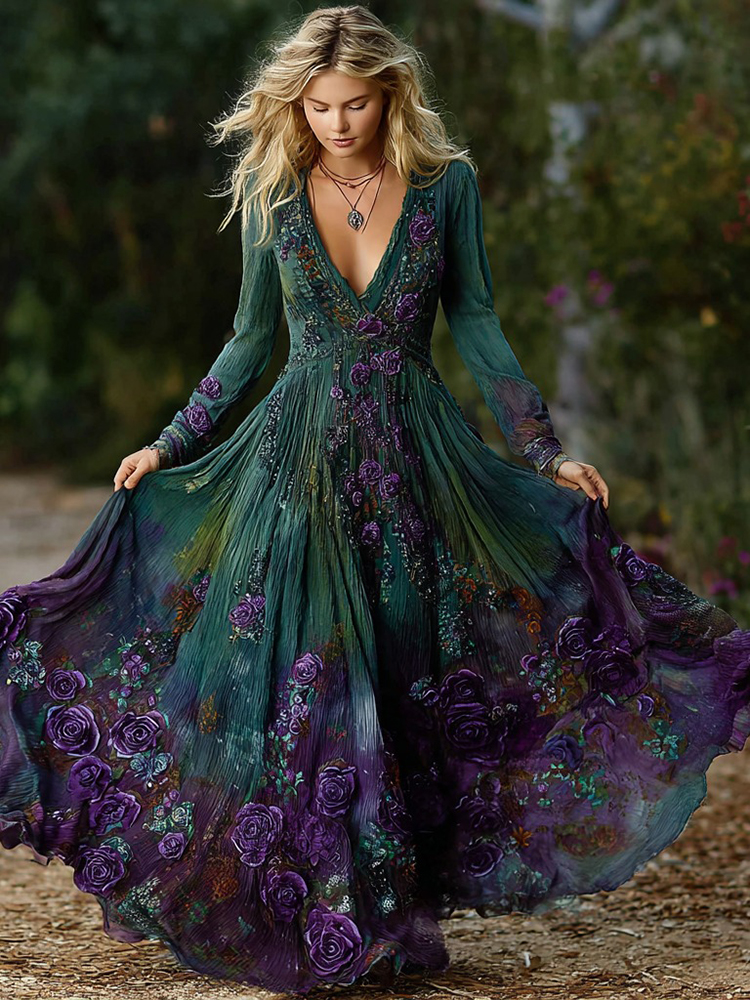Women's Vintage Purple Rose Art Pattern Gradient Long Sleeve Dress