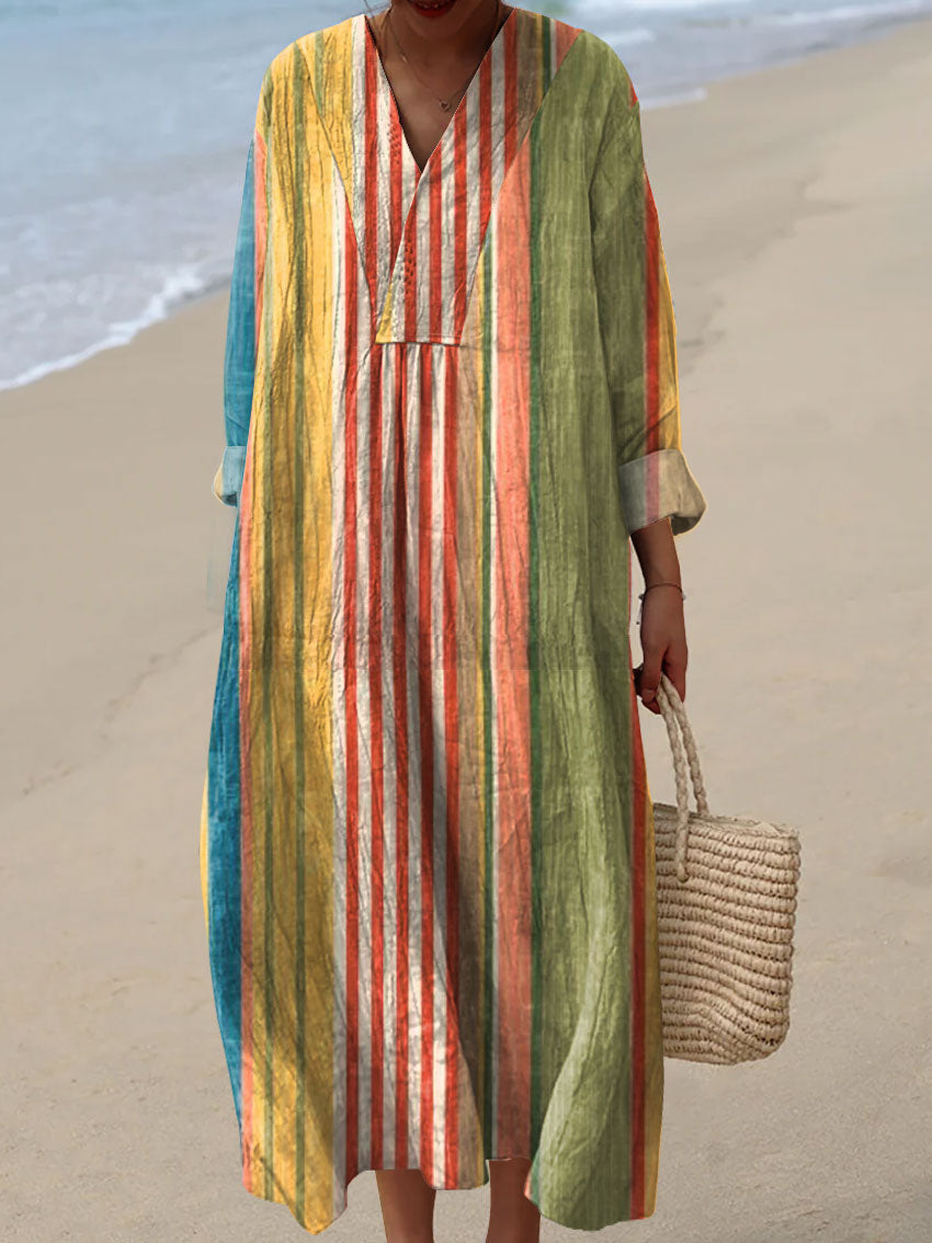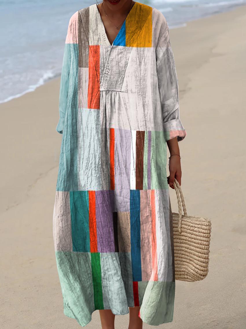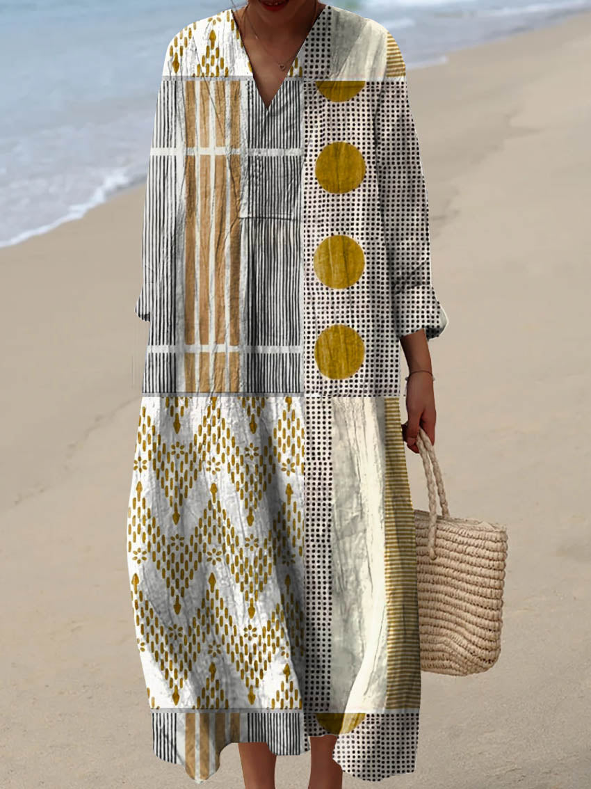 Women's Artistic Color Block Texture Pattern Pocket Cotton Dress