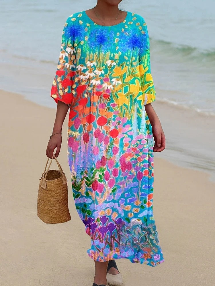 Women's Vintage Flower Art Print Flowy Dress