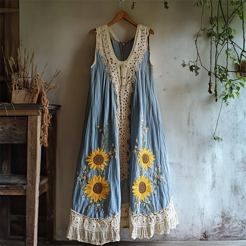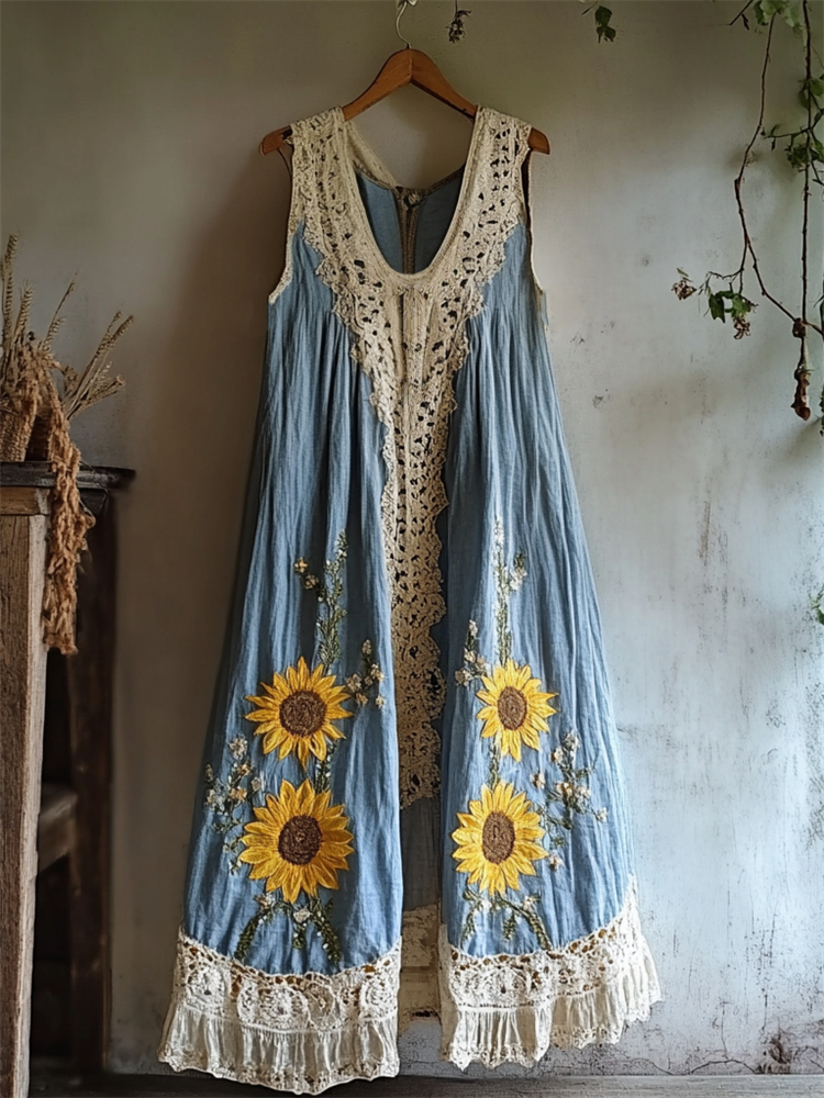 Boho Sunflowers Embroidered Lace Patchwork Linen Dress