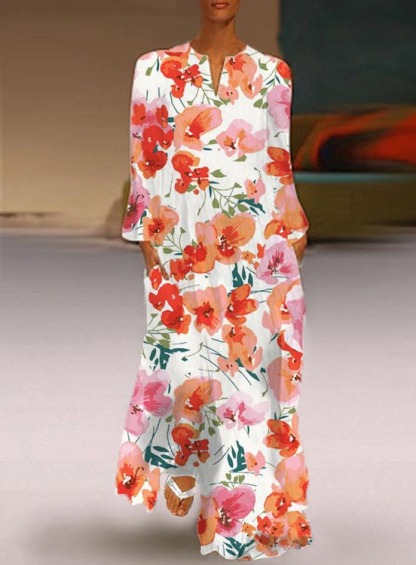 Casual Floral V Neck Long Sleeve Dress