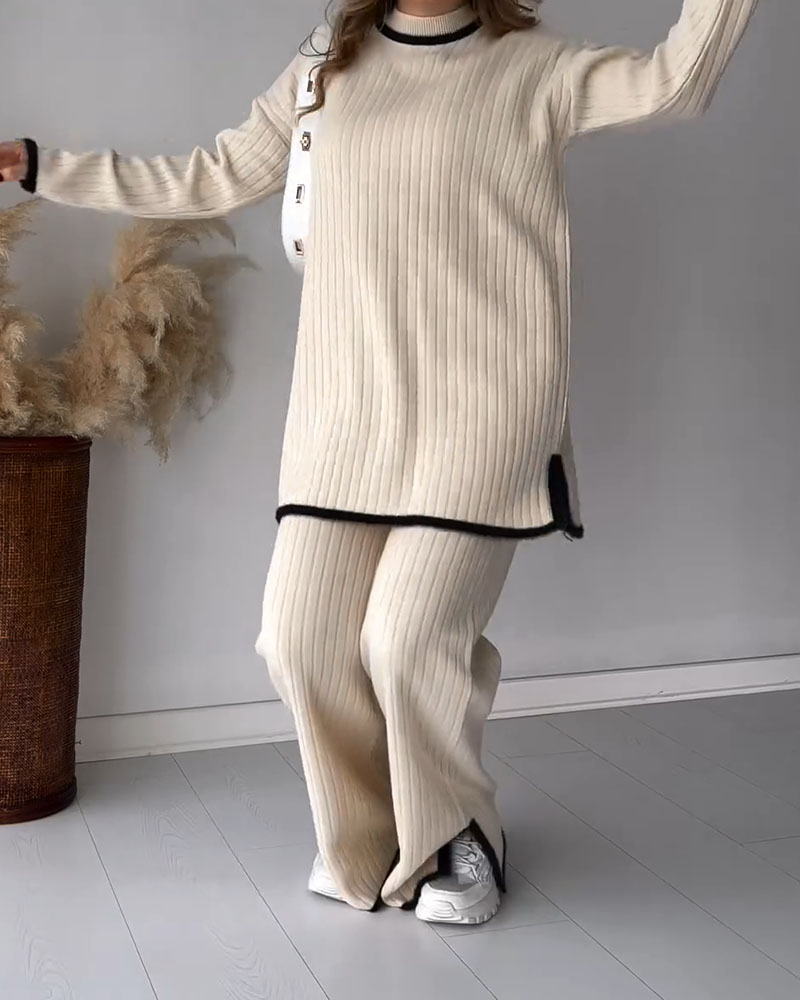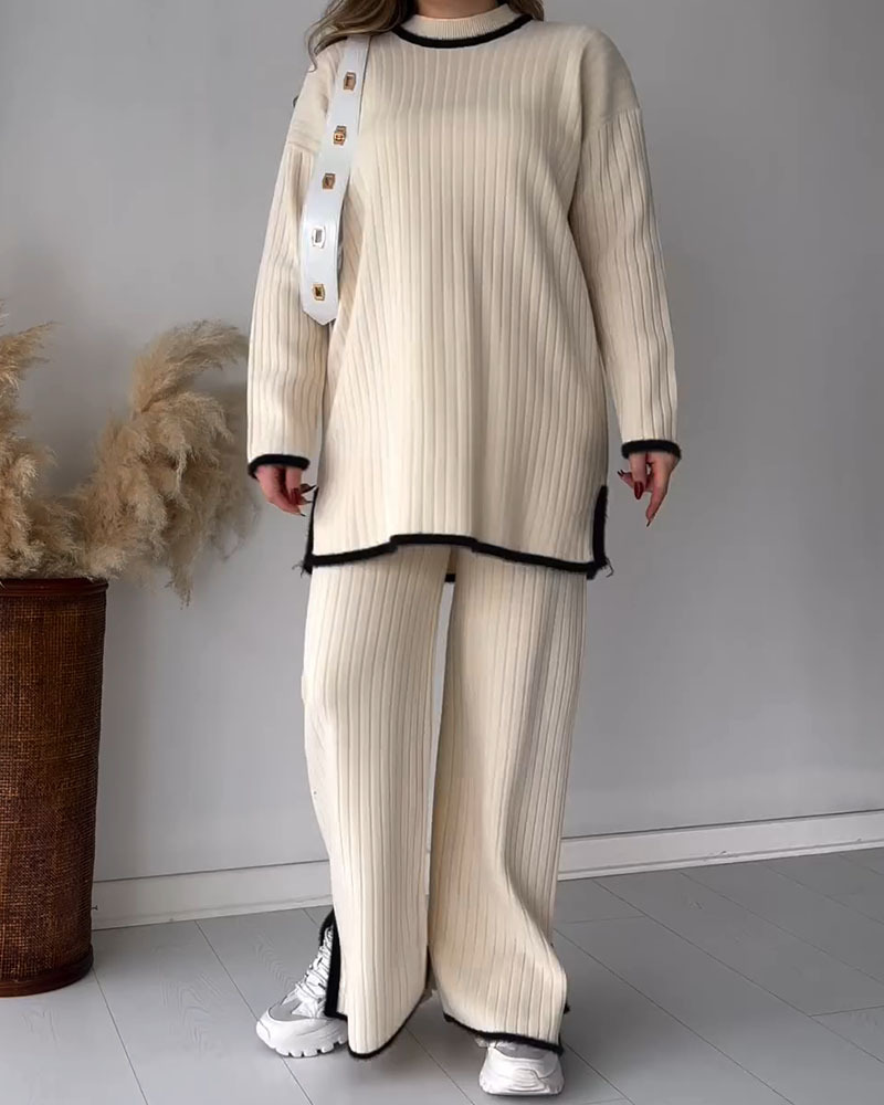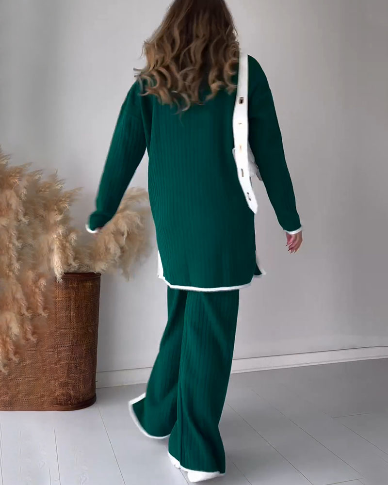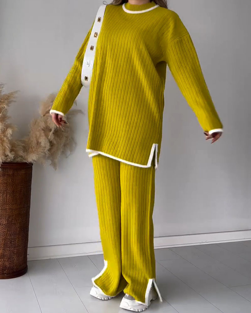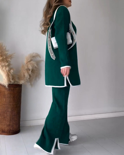 Contrast color edge slit casual two-piece set