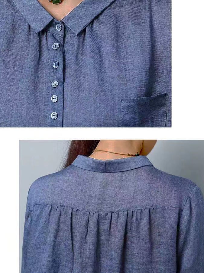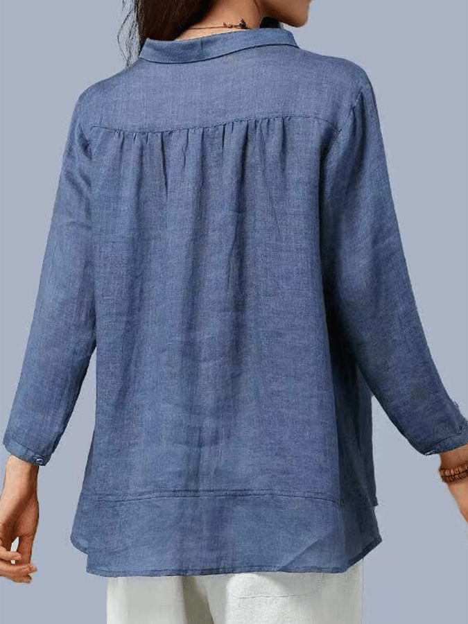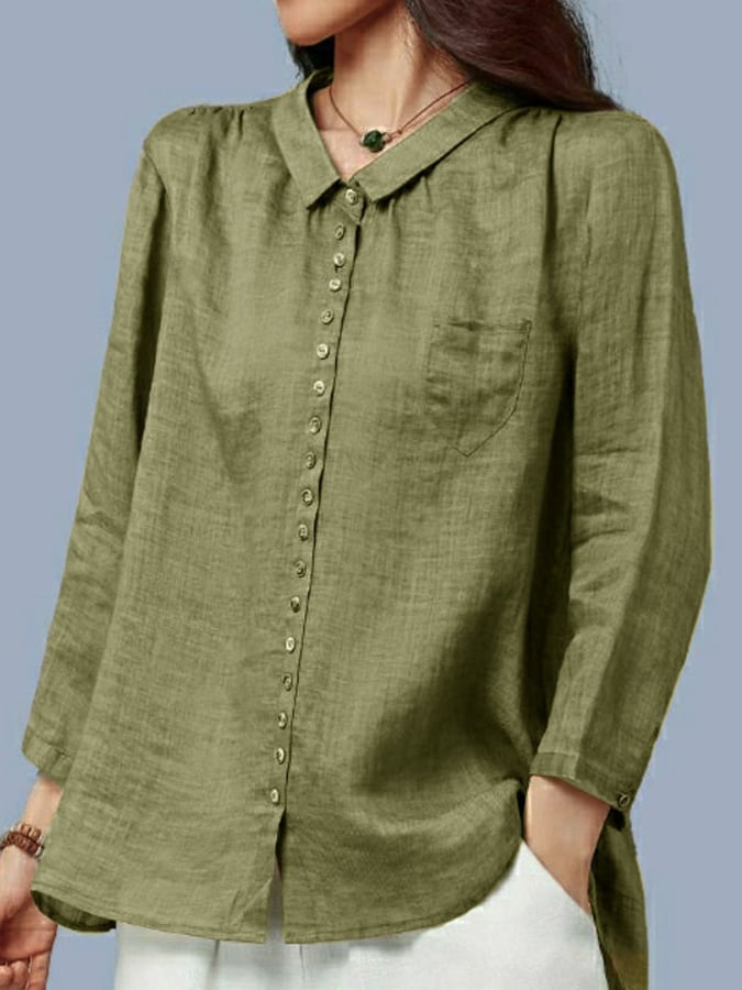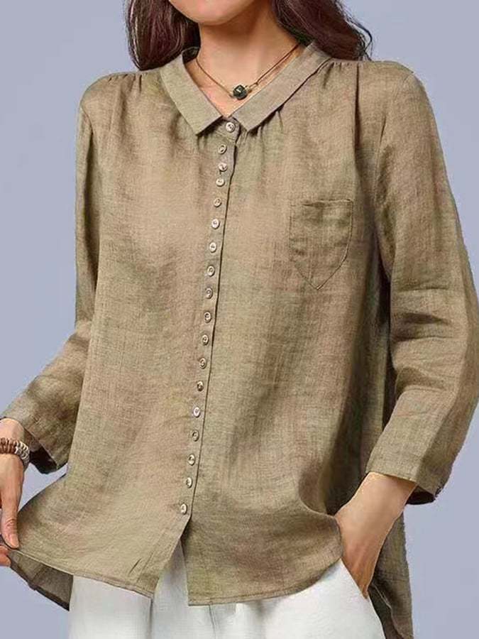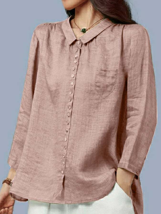 Ladies Solid Color Lapel Button Design Casual Cotton And Linen Shirt