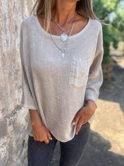 Round Neck Pocket Casual Cotton and Linen T-shirt