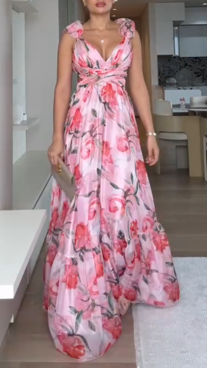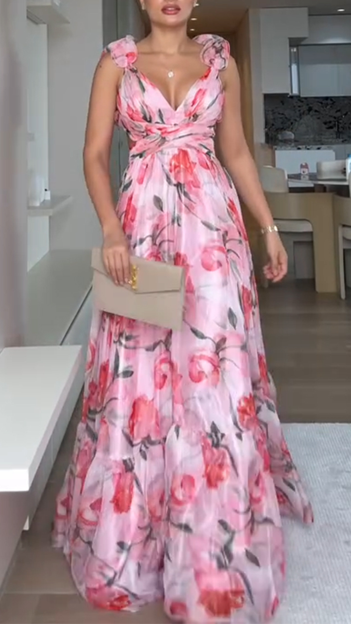 This is a long, off-the-shoulder pink floral print dress. GZ0926