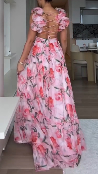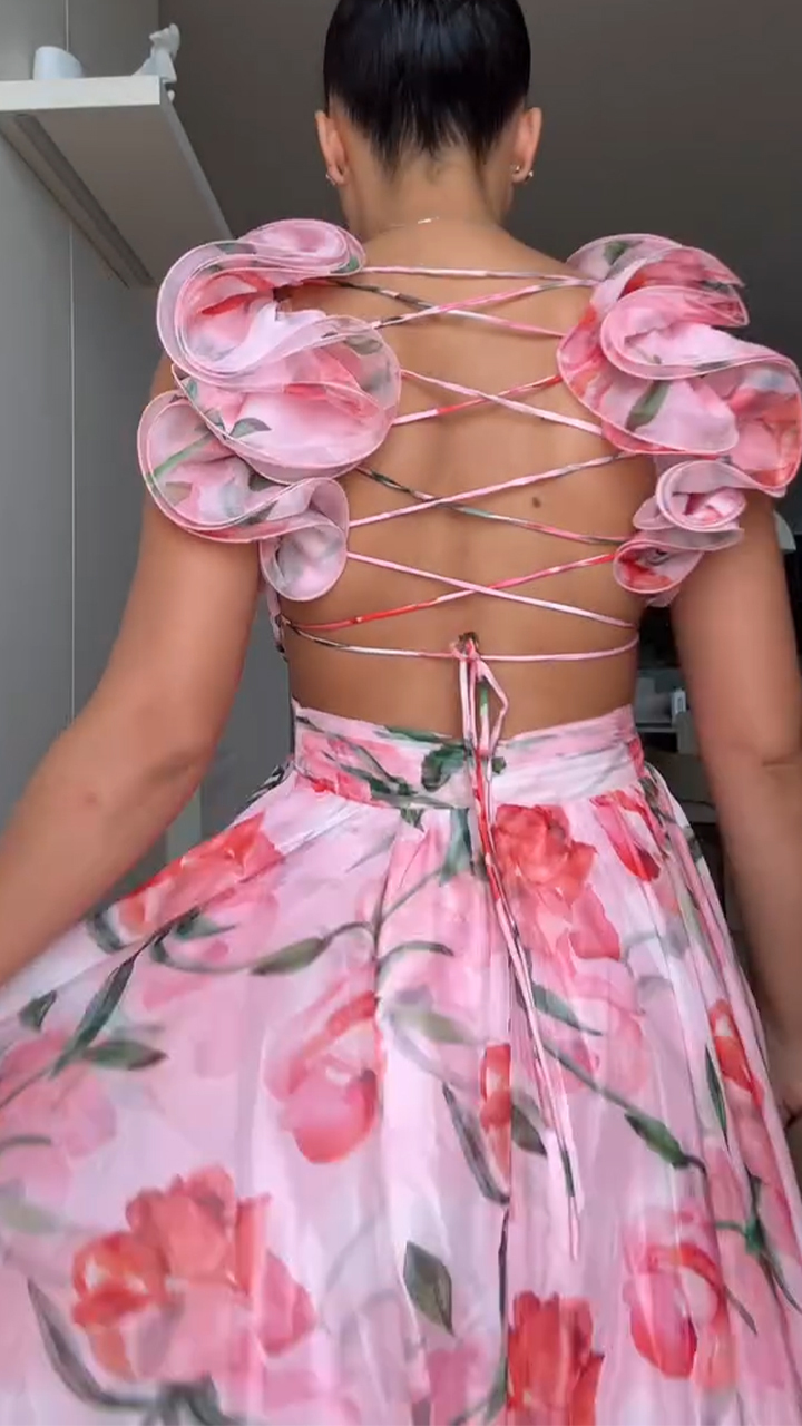 The Backless Printed Maxi Dress is your effortless statement piece for sunny days and breezy evenings. With its romantic floral print, ruffled sleeves, and open lace-up back, it blends comfort with feminine charm—perfect for garden parties, vacations, or casual outings.