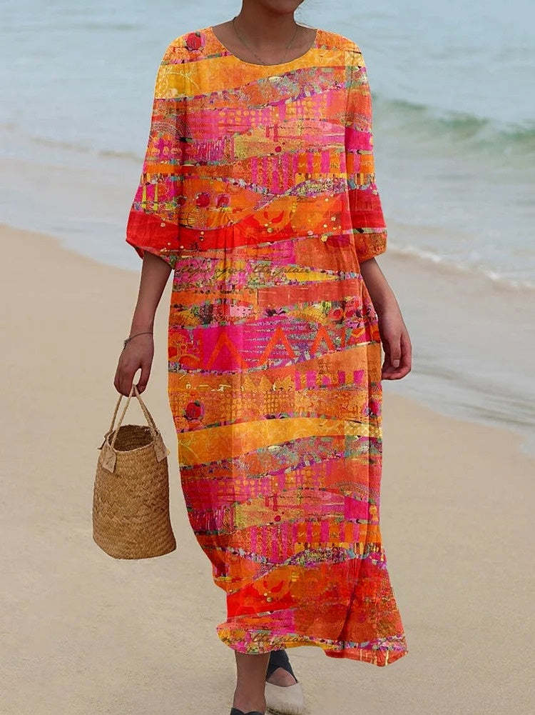 Women's Artistic Color Block Texture Pattern Pocket Cotton Dress