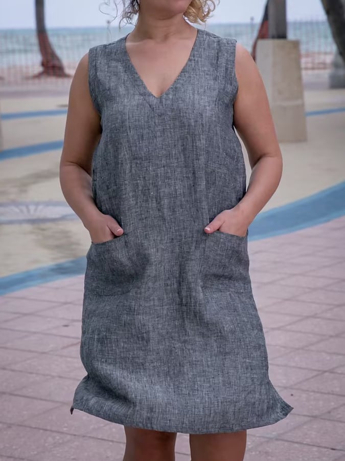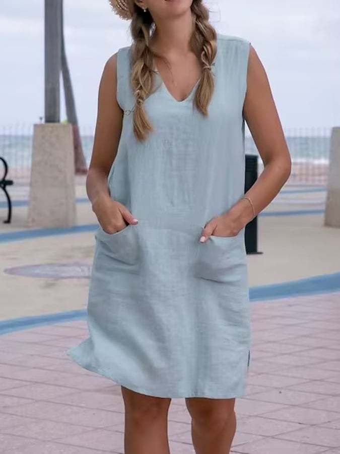 Women's Cotton Linen V-Neck Sleeveless Dress