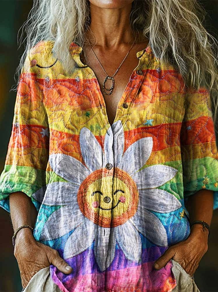 Women's Cute Hippie Daisy Print Casual Cotton Linen Shirt