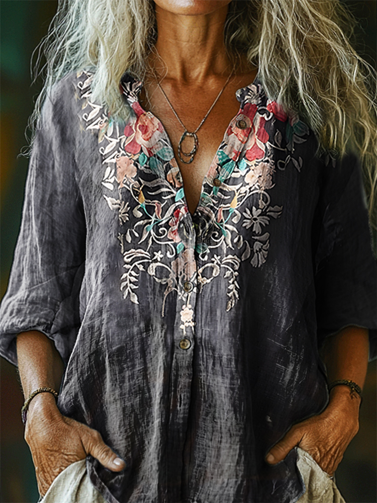 Women's Floral Pattern Art Print Casual Cotton Linen Shirt
