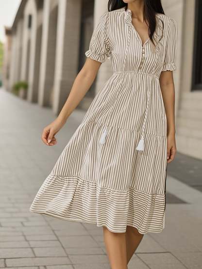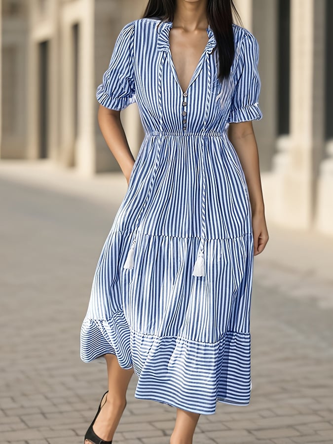 Women's Retro Striped Short-Sleeved V-Neck Elastic Waist Dress