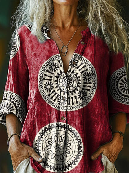 Women's Vintage Bohemian Floral Art Print Casual Cotton Linen Shirt