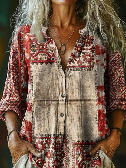 Women's Vintage Ethnic Art Print Comfortable Long Sleeve Cotton Shirt