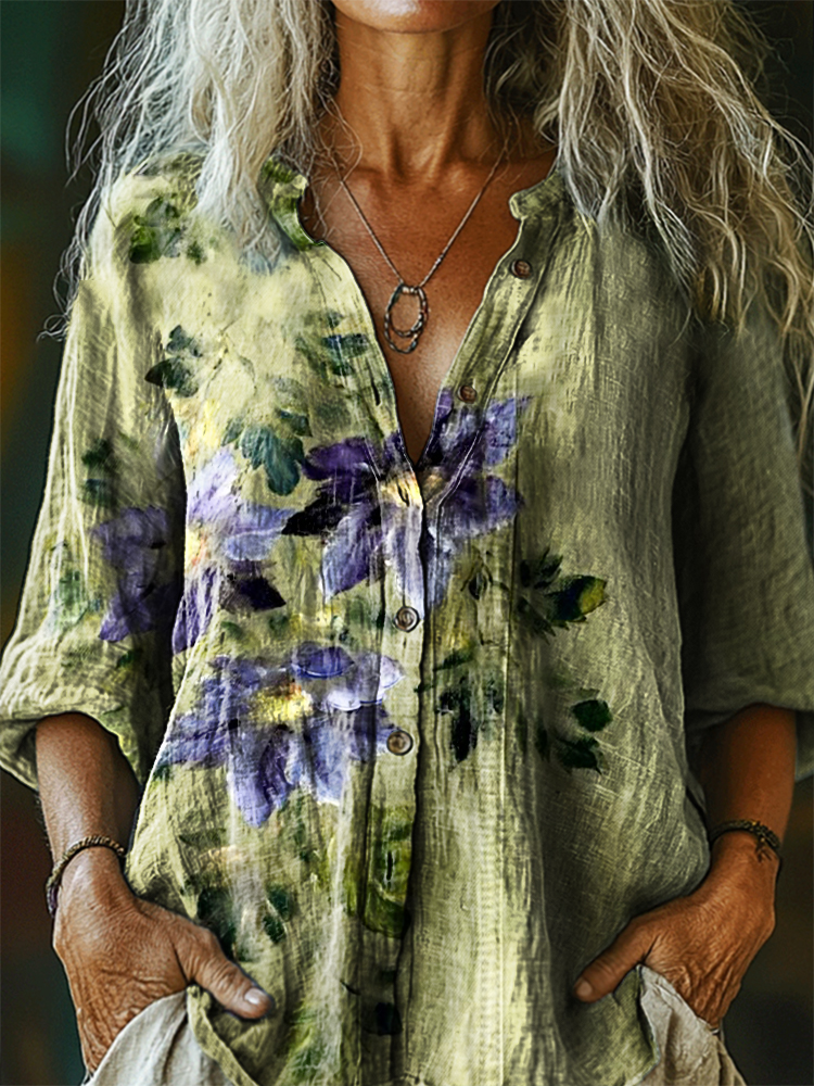 Women's Vintage Floral Art Print Casual Cotton Linen Shirt