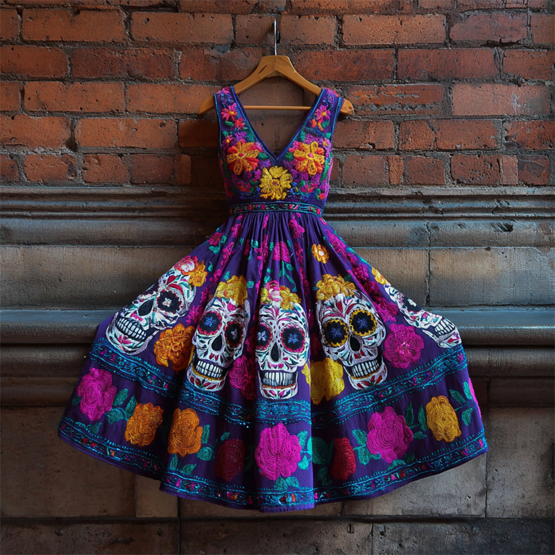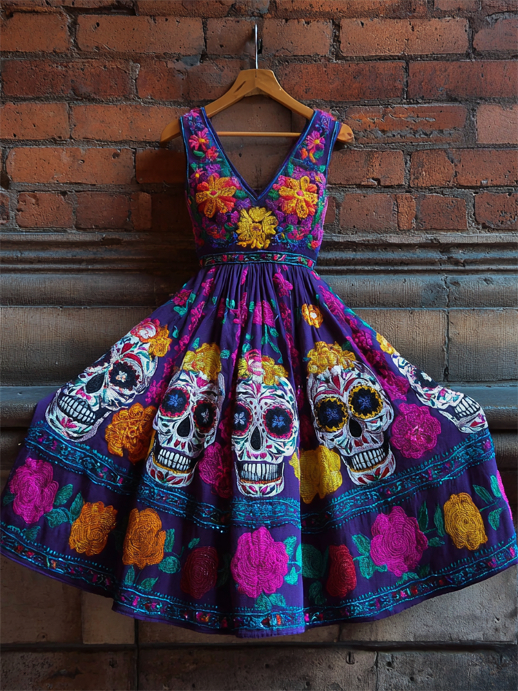 Day Of The Dead Sugar Skulls Floral Embroidered Linen Dress