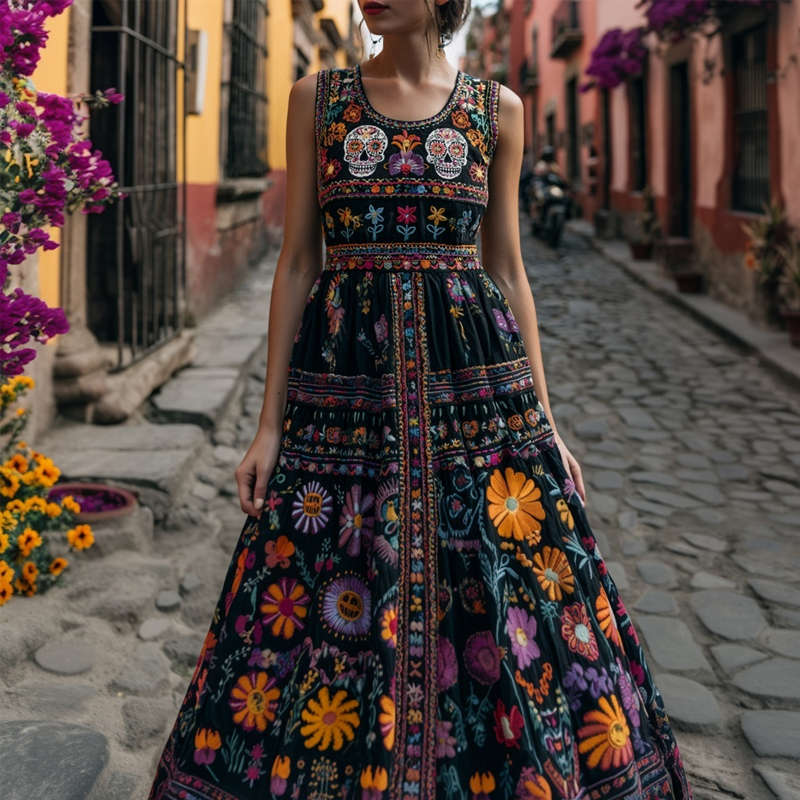 Day Of The Dead Sugar Skulls Floral Embroidered Linen Maxi Dress