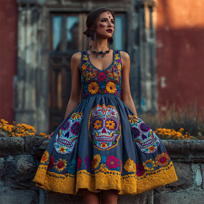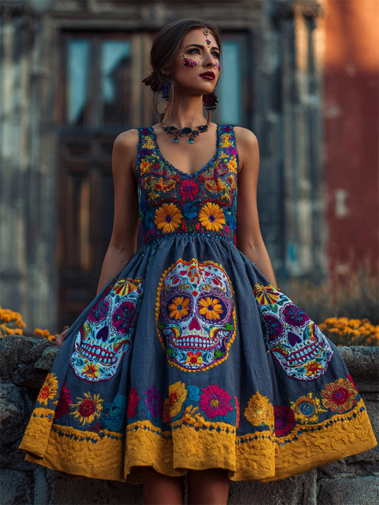 Day Of The Dead Sugar Skulls Marigolds Floral Linen Dress