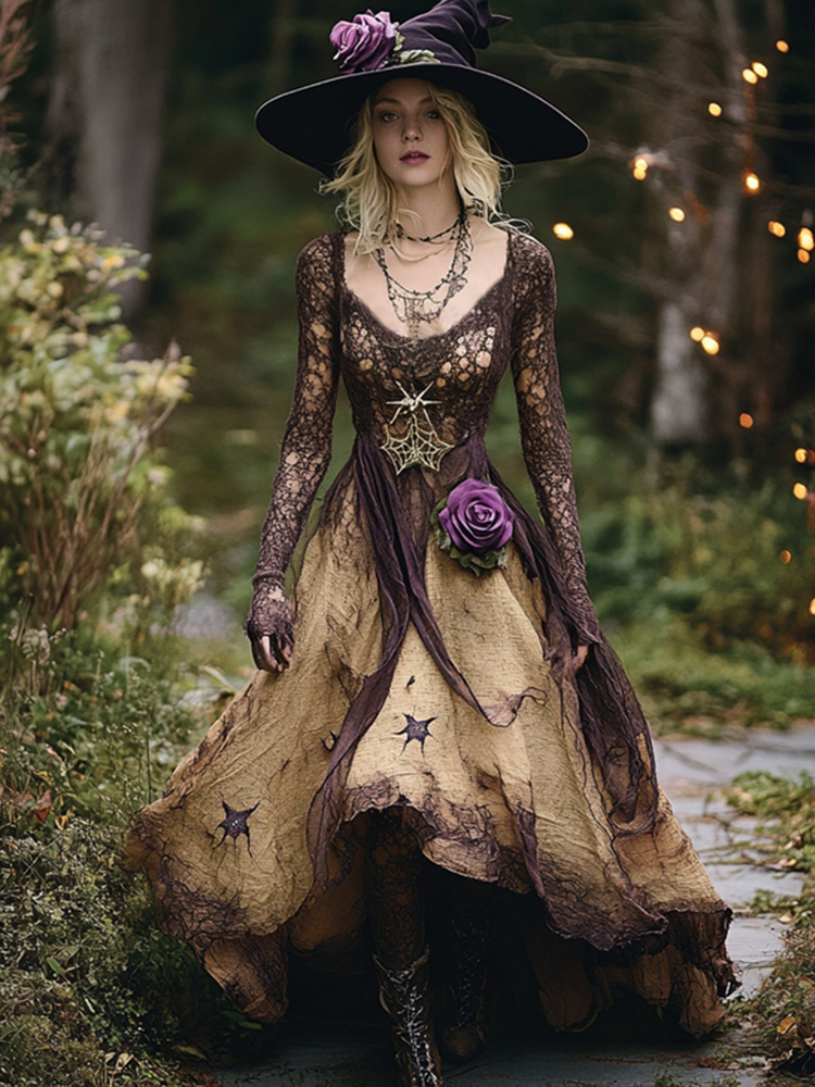 Halloween Themed Tie-dye Gradient Lace Patchwork Witch Maxi Dress