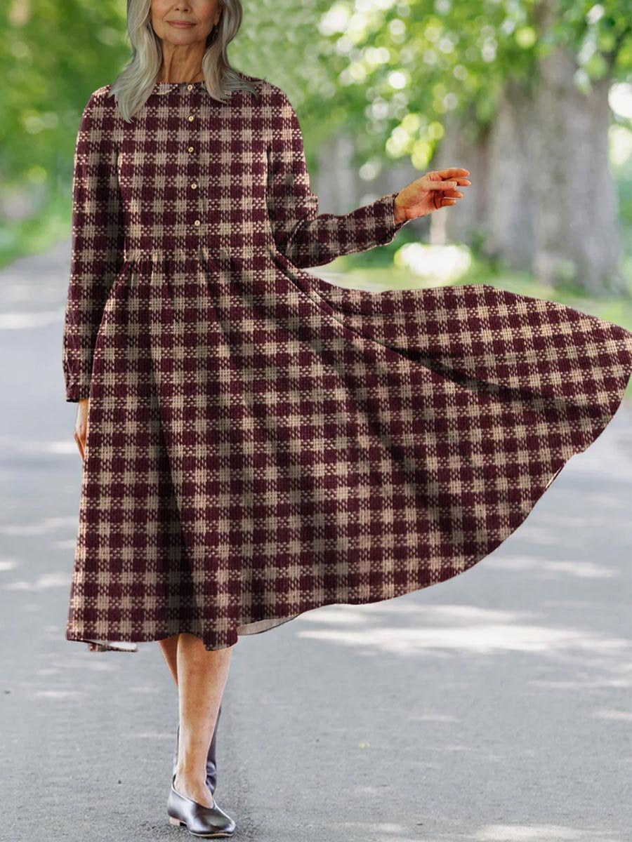Little Boy Collar Check Print Dress Pocket Cotton Midi A-Line Dress