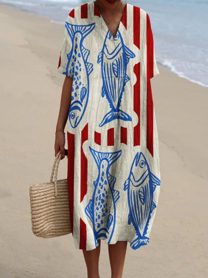 Red and White Stripes and Hand Drawn Fish Decorative Pattern Flowy Dress