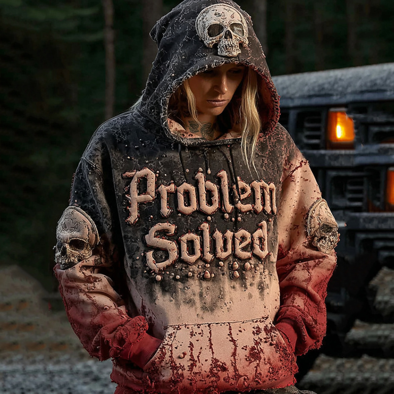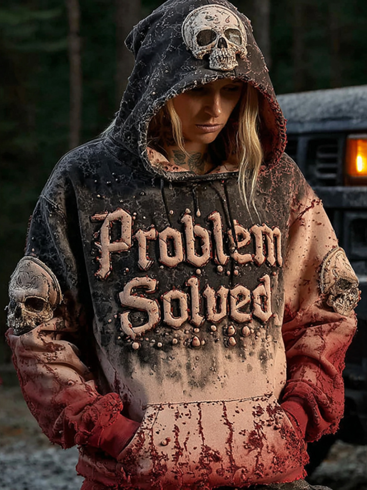 Unisex Vintage Bloody "problem Solved" With Skull Art Hoodie